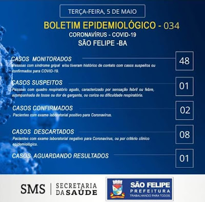 A Prefeitura Municipal de São Felipe, através da Secretaria Municipal de Saúde, confirmou na tarde desta terça-feira, 05 de maio, por meio de Boletim Epidemiológico o 2º caso confirmado de coronavírus (covid-19) na cidade. Segundo informações, o paciente infectado apresenta sintomas leves e encontra-se em isolamento domiciliar recebendo todo o cuidado necessário. Diante desse novo caso, a prefeitura reforça o pedido para que os moradores do município mantenha o distanciamento social, faça o uso da máscara, que façam a higienização correta das mãos, evitem aglomeração e sair de casa sem necessidade.